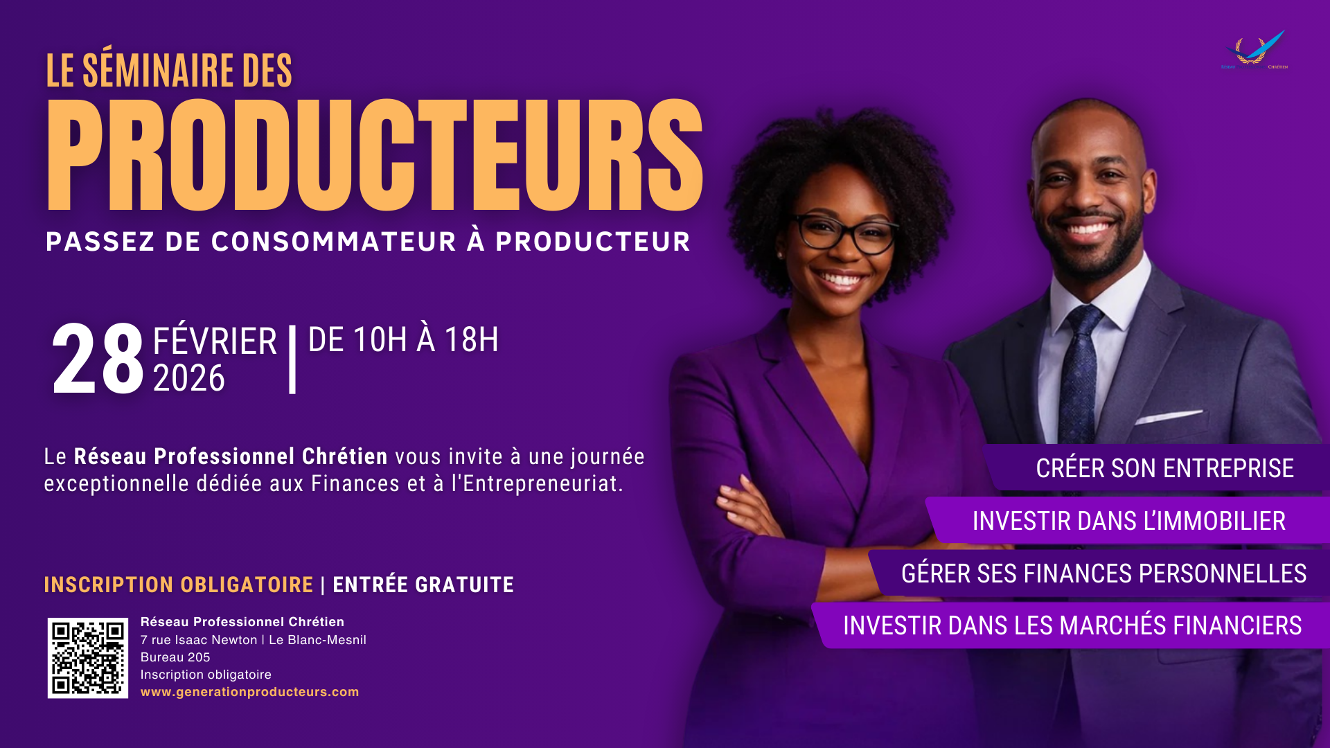Le samedi 28 février 2026, le Réseau Professionnel Chrétien vous donnera l’opportunité de passer de consommateur à Producteur lors d’un séminaire unique conçu pour vous, qui souhaitez aligner votre vie financière avec vos valeurs et vos aspirations.